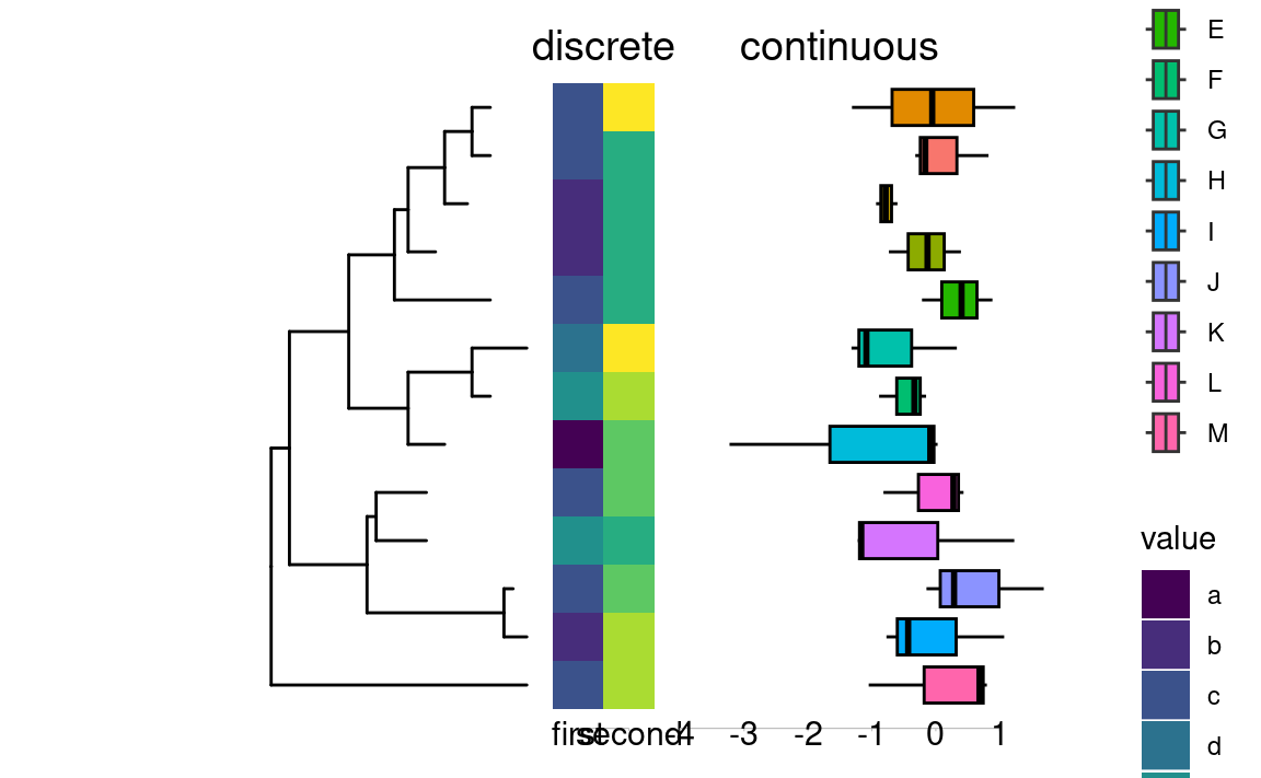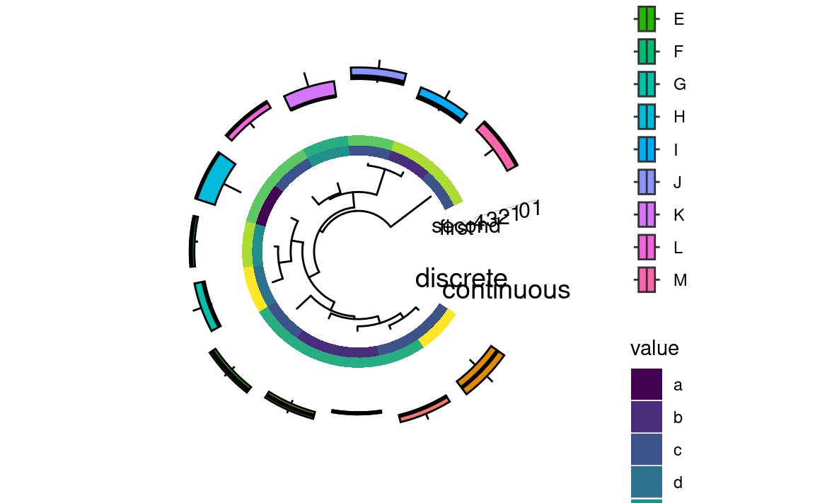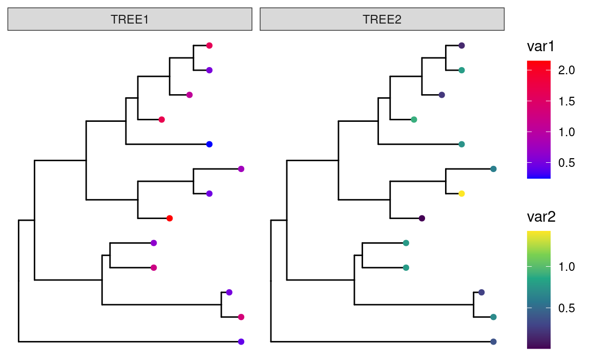当ggtree()的绘制对象是multiPhylo或treedataList时,可以使用facet_wrap()或facet_grid()进行多颗树分面。可以使用ggnewscale包中的new_scale_*()来添加新的美学映射: