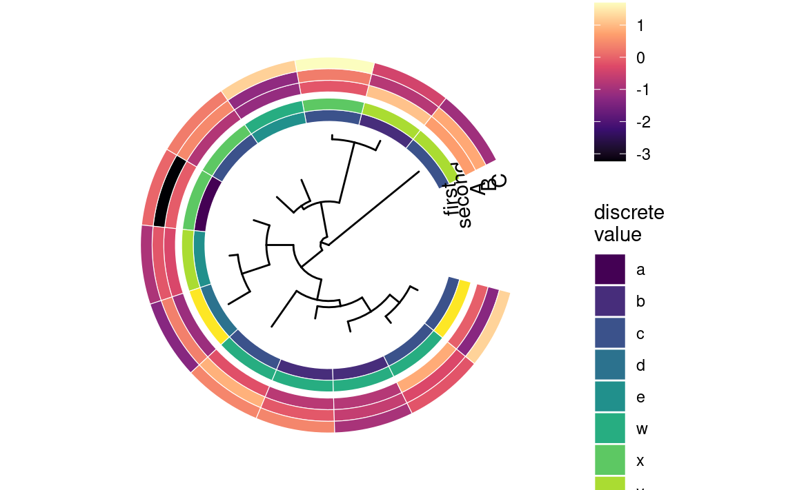 gheatmap()在ggplot2对象基础上绘制热图,并且可以添加多个热图: