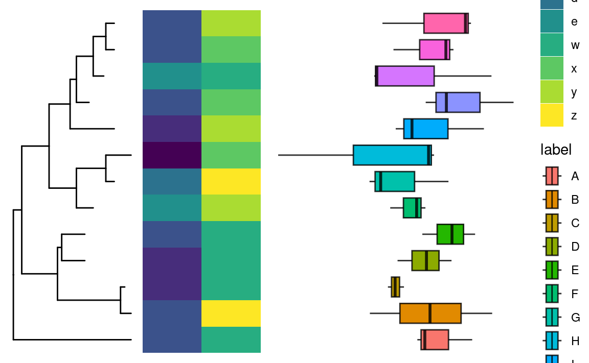 很多时候我们要将不同类型的图与树进行组合,这种组合不是简单的拼接,需要将每个tip进行对齐,实现此类目标大致可以通过三种方式: