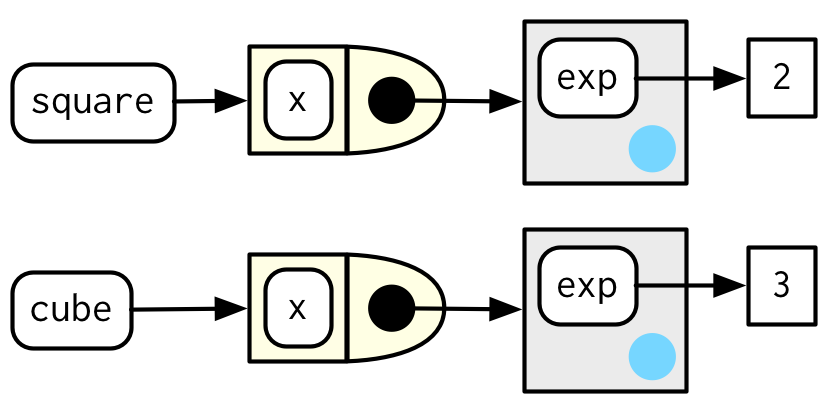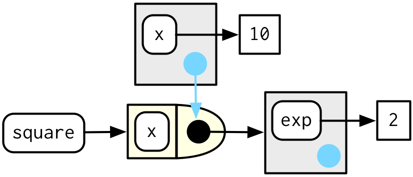 当执行square(10)时,我们可以预料到:x^exp中的x在函数的执行环境中,exp在函数的创建环境中。