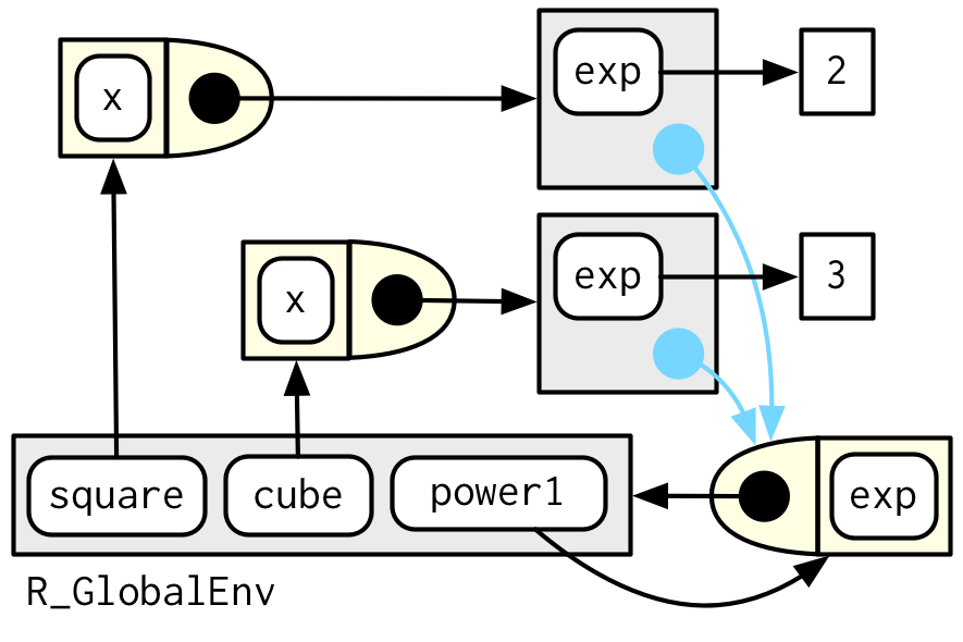 #> <environment: 0x000001acc1367208>从两个函数的结构中,我们可以清晰地知道参数x的值来源,但参数exp的值来源呢?仔细观察会发现,两个函数的主体结构是相同的,它们绑定的创建环境不同。