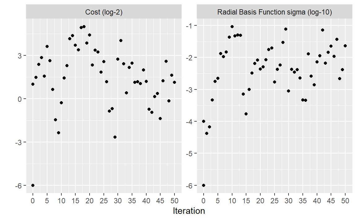 我们再次使用第13.2节中描述的细胞分割数据进行建模,并使用支持向量机(SVM)模型来演示迭代搜索方法。有关SVM模型的更多信息,请参见 M. Kuhn和Johnson(2013)。需要优化的两个调优参数是SVM的成本值和径向基函数核参数 \(\sigma\)。这两个参数都会对模型的复杂性和性能产生深远影响。