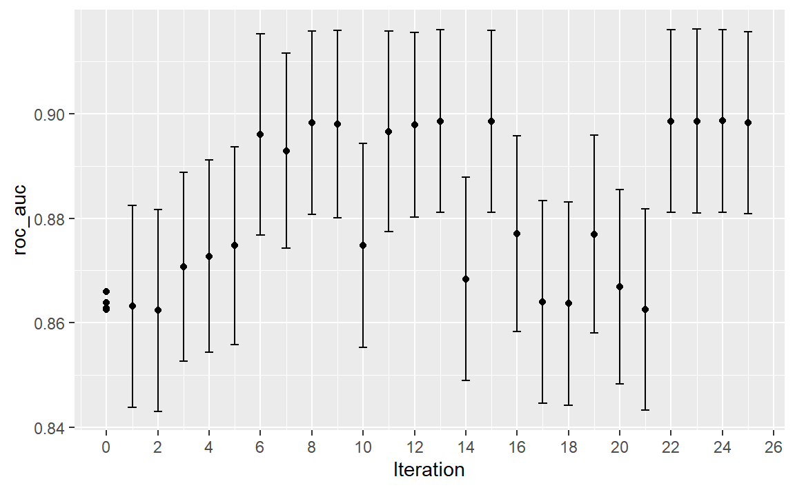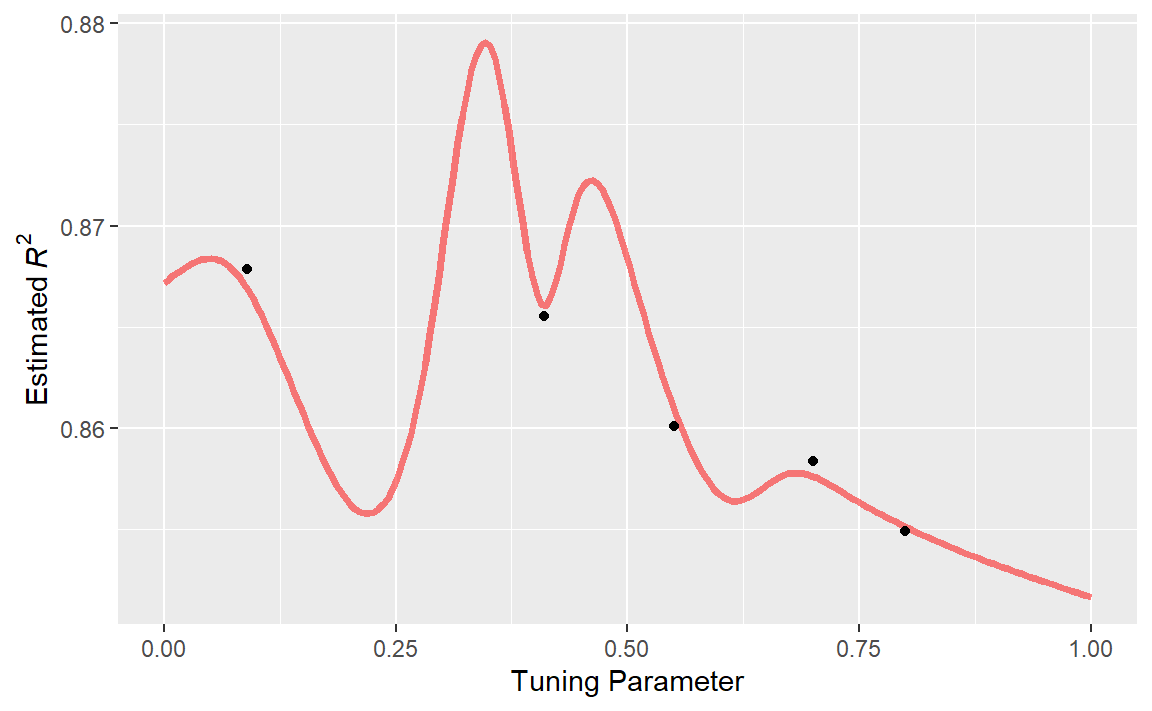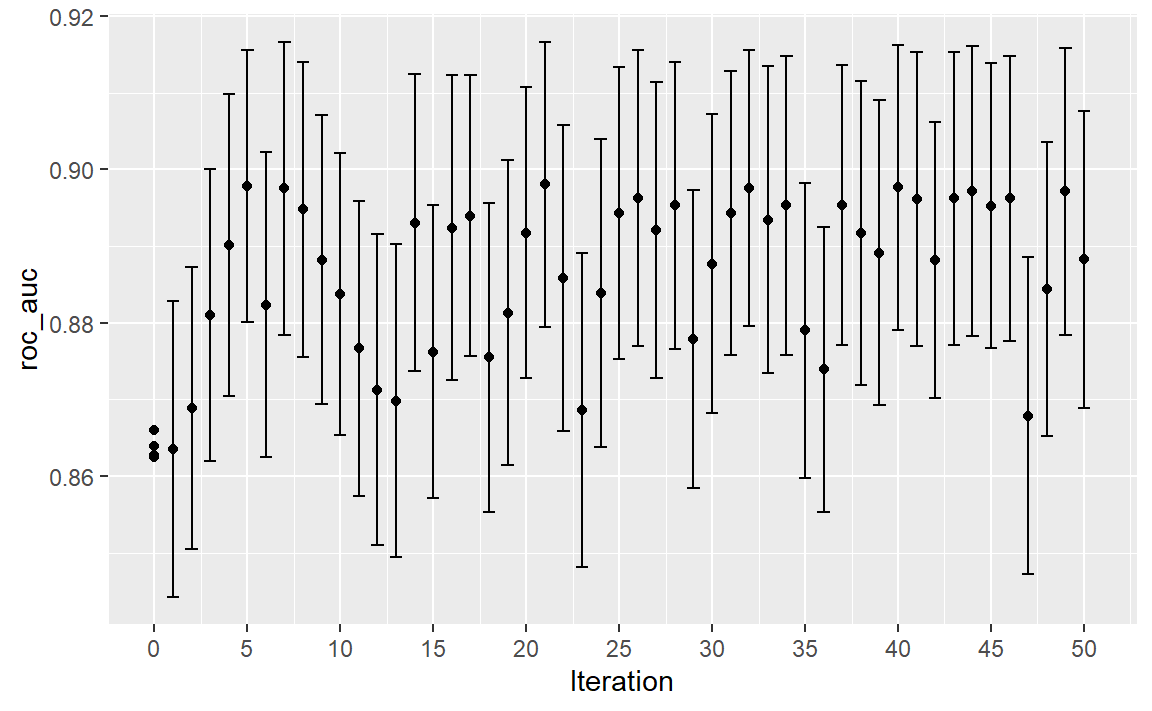 #> maximum number of iterations reached 0.01490685 0.01480023搜索过程从ROC曲线下面积的初始最佳值 0.8659 开始。高斯过程模型利用这四个统计量来构建模型。大型候选集通过“期望改进”函数自动生成并评分。