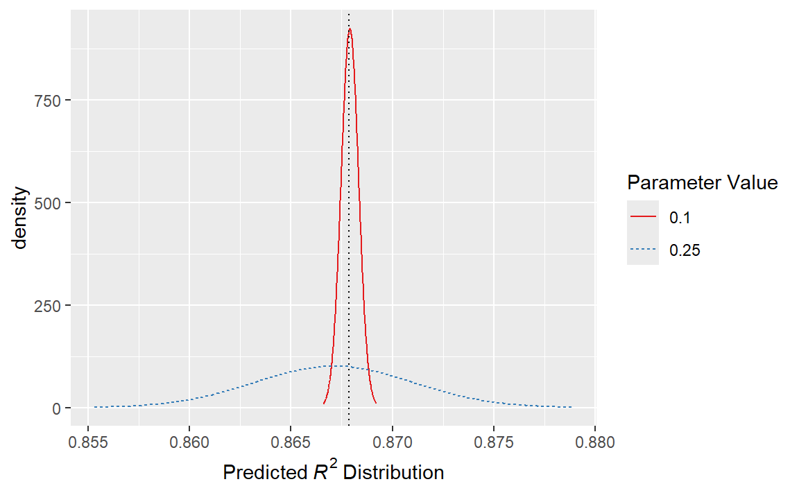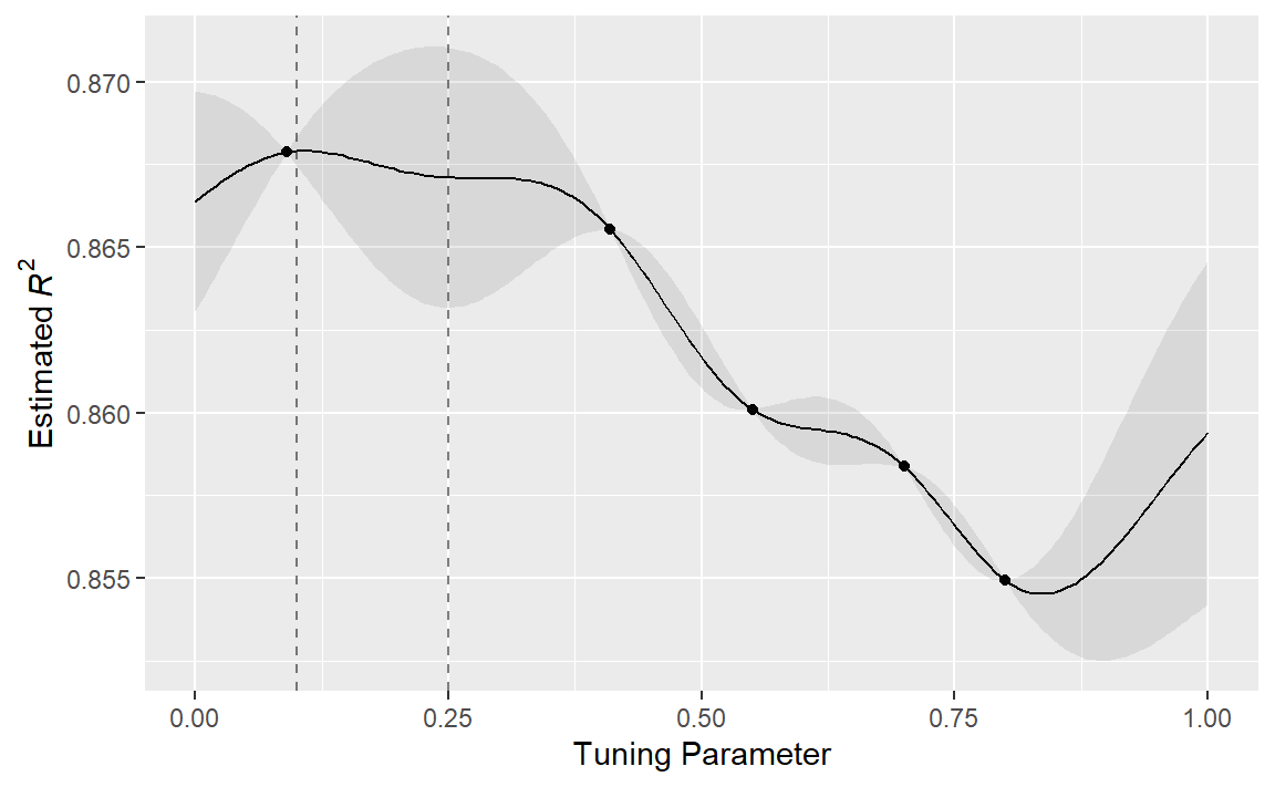 其中 \(\sigma^2_{ij}\) 是一个恒定的误差方差项,当 \(i = j\) 时,该误差方差项为零。这个方程可转化为:随着两个调优参数组合之间距离的增加,性能指标之间的协方差呈指数增长。该方程的性质还意味着,结果指标的变异在已观测到的点处达到最小(即当 \(|x_i−x_j|^2\) 为零时)。这种协方差函数的特性使得高斯过程即便在只有少量数据的情况下,也能够表征模型性能与调优参数之间高度非线性的关系。然而,在某些情况下,拟合这些模型可能会很困难,而且随着调优参数组合数量的增加,模型的计算成本会变得更高。