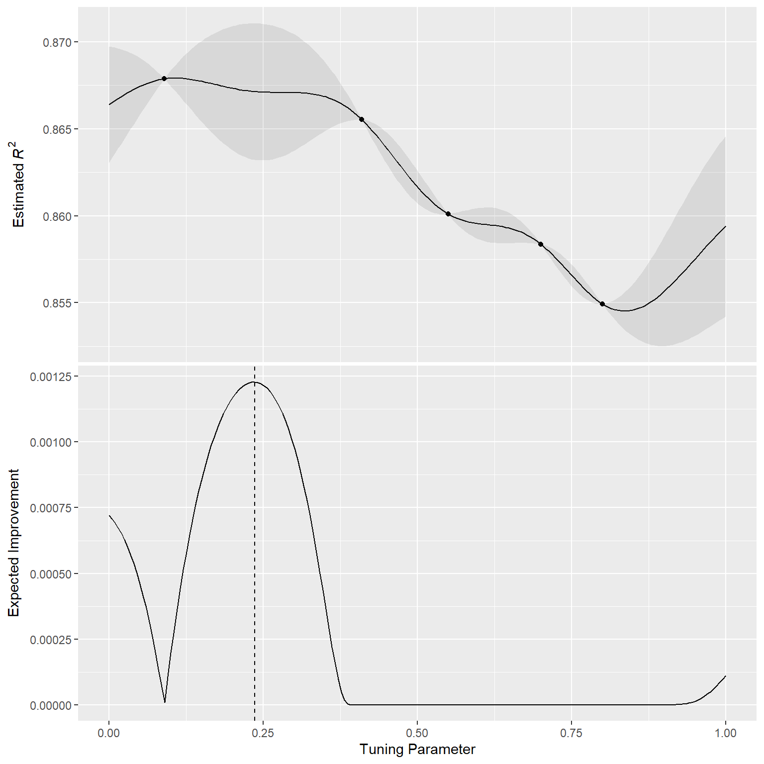 一旦高斯过程拟合了当前数据,它将如何被使用呢?我们的目标是选择下一个最有可能比当前最佳结果“更好”的调优参数组合。实现这一目标的一种方法是创建一个大型候选集(或许可以采用空间填充设计),然后对每个候选参数组合进行均值和方差预测。利用这些信息,我们就能选出最有利的调优参数值。