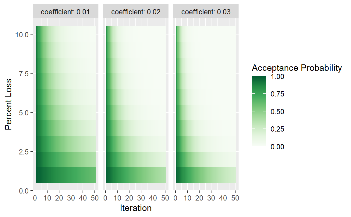 其中i是迭代次数,\(c\) 是用户指定的常数,\(D_i\) 是新旧值之间的百分比差异(负值意味着结果更差)。对于较差的结果,我们会计算接受概率,并将其与一个随机均匀数进行比较。如果随机数大于该概率值,搜索会舍弃当前参数,下一次迭代会在之前值的邻域内生成候选值。否则,下一次迭代会基于当前(次优)值形成下一组参数。