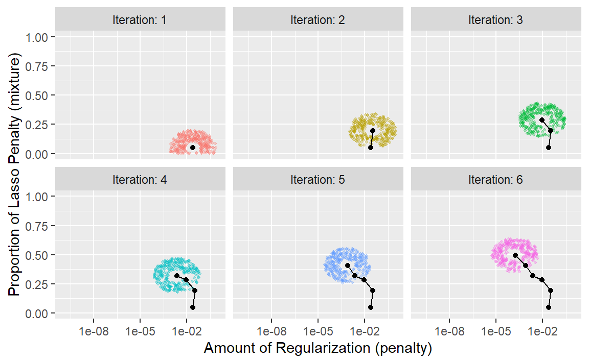 该过程从初始值penalty = 0.025和mixture = 0.050开始。使用一个在0.050到0.015之间随机波动的半径,对数据进行适当缩放,在初始点周围的半径范围内生成随机值,然后随机选择一个作为候选值。为便于说明,我们假设所有候选值都是更优的。利用这个新值,生成一组新的随机邻近值,从中选择一个,依此类推。Figure 8 展示了搜索过程向左上角推进的六个迭代步骤。