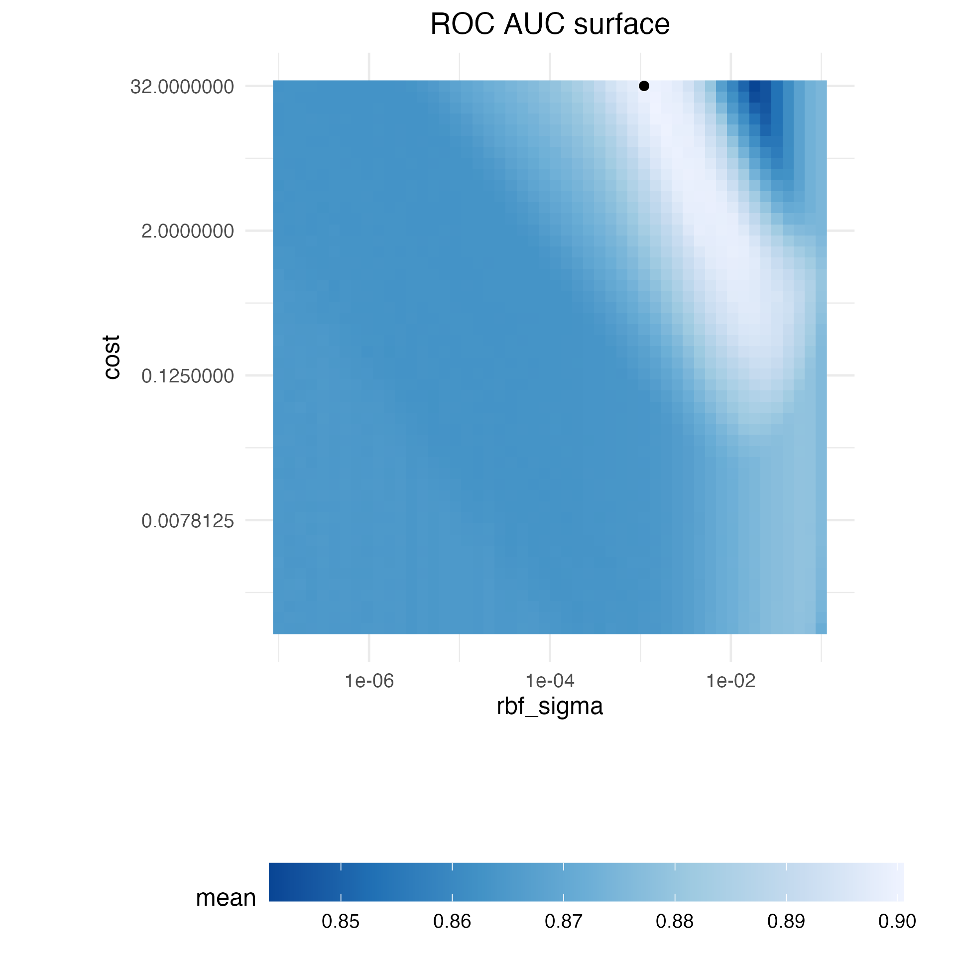 Figure 1 展示了对该网格的评估结果,其中颜色越浅表示模型性能越高(越好)。参数空间的左下对角线区域有一大片相对平缓的区域,性能较差。性能最佳的脊线出现在该空间的右上部分。黑点表示最佳设置。从性能不佳的平台区域到性能最佳的脊线区域的过渡非常陡峭。在脊线右侧紧邻的位置,ROC曲线下面积也出现了急剧下降。