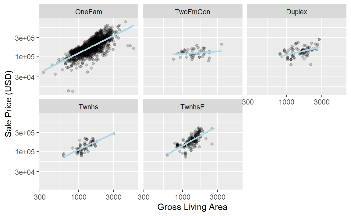 Bldg_Type,其中OneFam(n = 1,936),TwoFmCon(n = 50),Duplex(n = 88),Twnhs(n = 77),TwnhsE(n = 191))